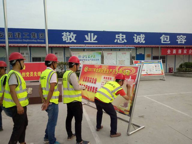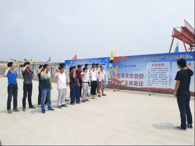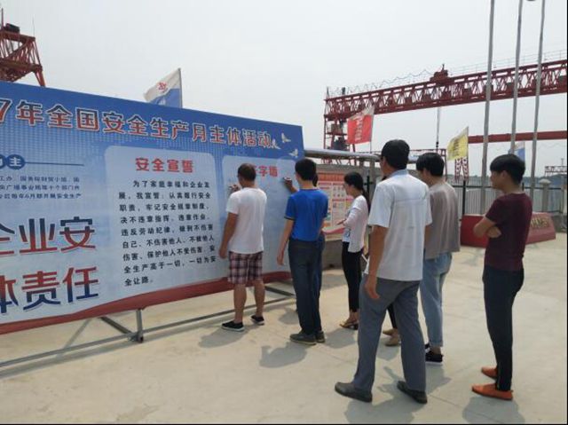 我是一名安徽建工人,我鄭重宣誓:時刻注意安全,遵守安全法規(guī)。履行安全職責,提高安全技能。杜絕三違現象,保證四不傷害。強化紅線意識,促進安全發(fā)展。為了家人幸福、企業(yè)發(fā)展,誓做建工“安全人”。錚錚誓言響徹云霄,筆尖揮斥千金承諾。6月1日至2日,安徽路港公司機關及所屬各單位、項目部莊嚴舉行了2017年“安全生產月”宣誓簽名儀式,拉開了今年以“全面落實企業(yè)安全生產主體責任”為主題的“安全生產月”系列活動序幕。