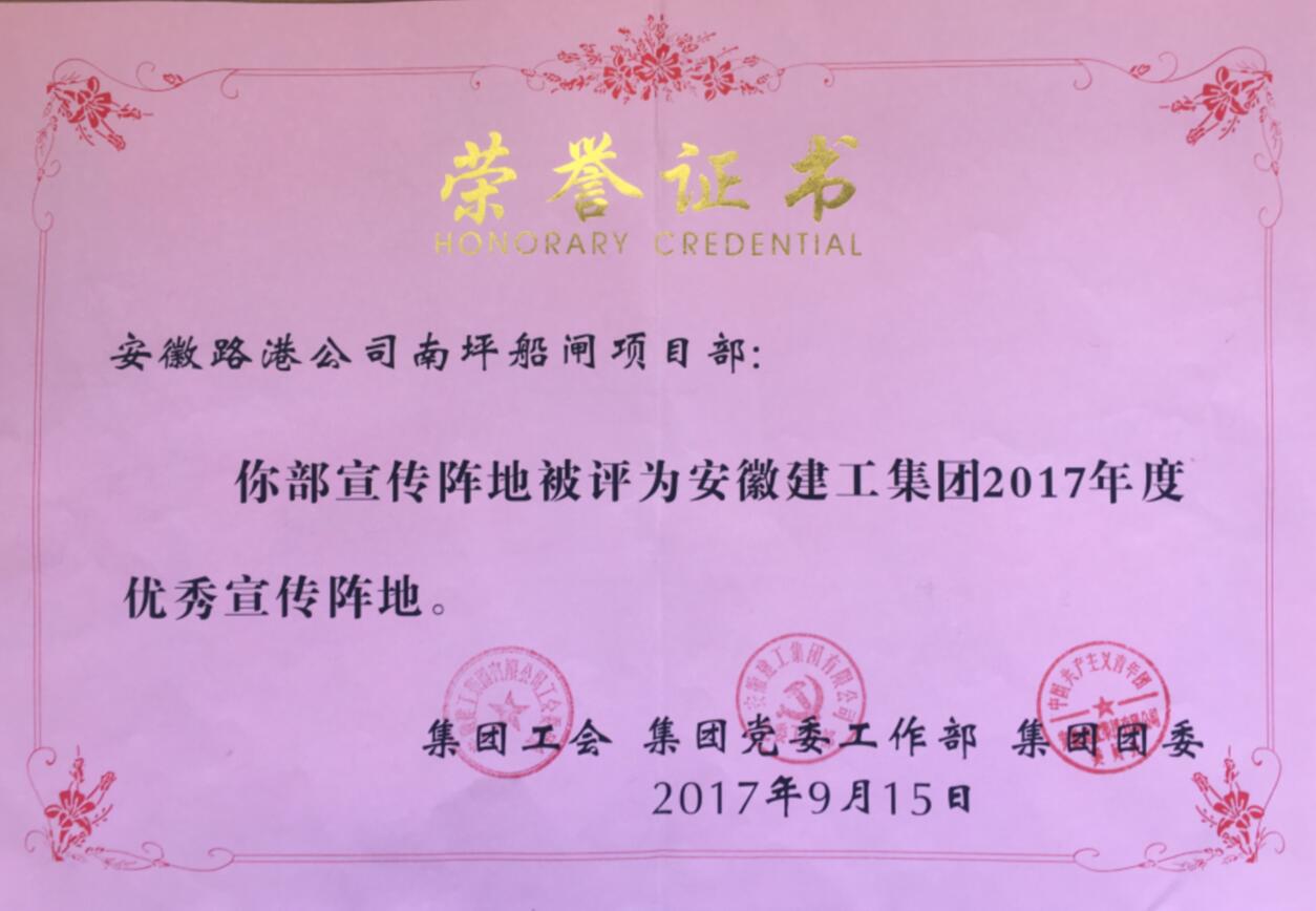近日,澮河南坪船閘項(xiàng)目部被集團(tuán)授予 “2017年度優(yōu)秀宣傳陣地”榮譽(yù)稱號(hào)。