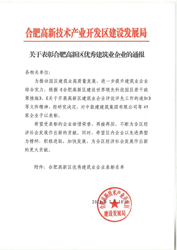 喜訊!安徽路港榮獲合肥高新區(qū)優(yōu)秀建筑企業(yè)表彰