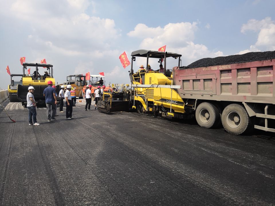 7月20日下午,郎溪路高架四標(biāo)項(xiàng)目部順利完成了橋面瀝青試驗(yàn)段攤鋪。