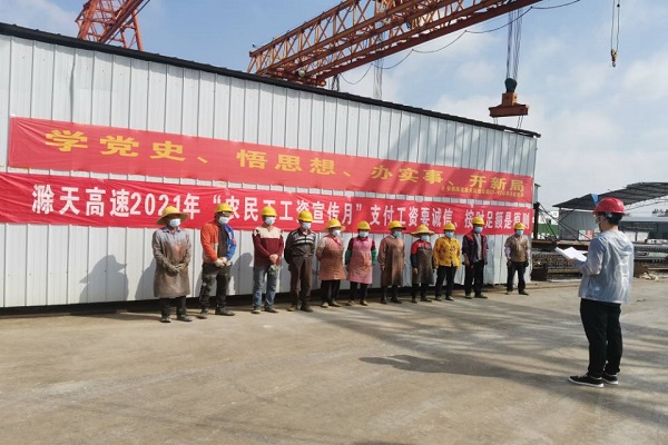 5月27日,滁天預(yù)制標(biāo)項(xiàng)目部聯(lián)合滁天高速項(xiàng)目辦及總監(jiān)辦舉行滁天高速2021年“農(nóng)民工工資宣傳月”活動。