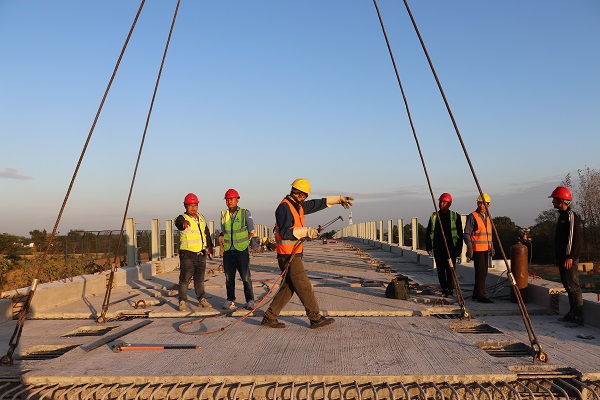該橋為K109+452車行天橋,橋長117m,橋面寬度均為8.5m,跨徑為25+30*2+25m鋼板組合梁,鋼梁重136t。施工前,項目技術(shù)負責人根據(jù)專項施工方案對作業(yè)人員進行詳細的安全技術(shù)交底,對原道路采取提前公告、封路進行警戒,同時確保所有安全監(jiān)護、吊索具檢驗、吊裝指揮、現(xiàn)場調(diào)度等保障措施到位。該橋順利通車,為后續(xù)標尾導改施工提供了良好條件,為項目部下步搶抓施工進度奠定了堅實基礎。