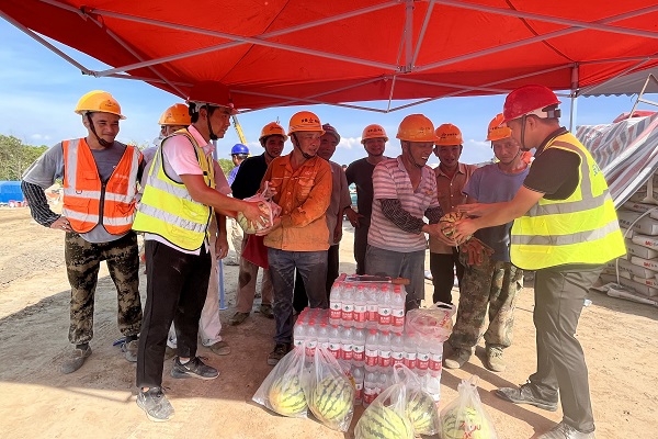 施工現(xiàn)場支起納涼棚,安全分管負(fù)責(zé)人為各位工友切分西瓜、發(fā)放飲用水,檢查他們是否隨身攜帶十滴水、仁丹、藿香正氣液等防暑降溫藥品。項(xiàng)目負(fù)責(zé)人強(qiáng)調(diào):各工區(qū)負(fù)責(zé)人要科學(xué)安排施工作業(yè),合理避開高溫時(shí)段,安全負(fù)責(zé)人要做到防暑降溫安全教育及藥品發(fā)放覆蓋全體班組人員,同時(shí)要嚴(yán)格落實(shí)夏季施工規(guī)范,保證工程施工安全。