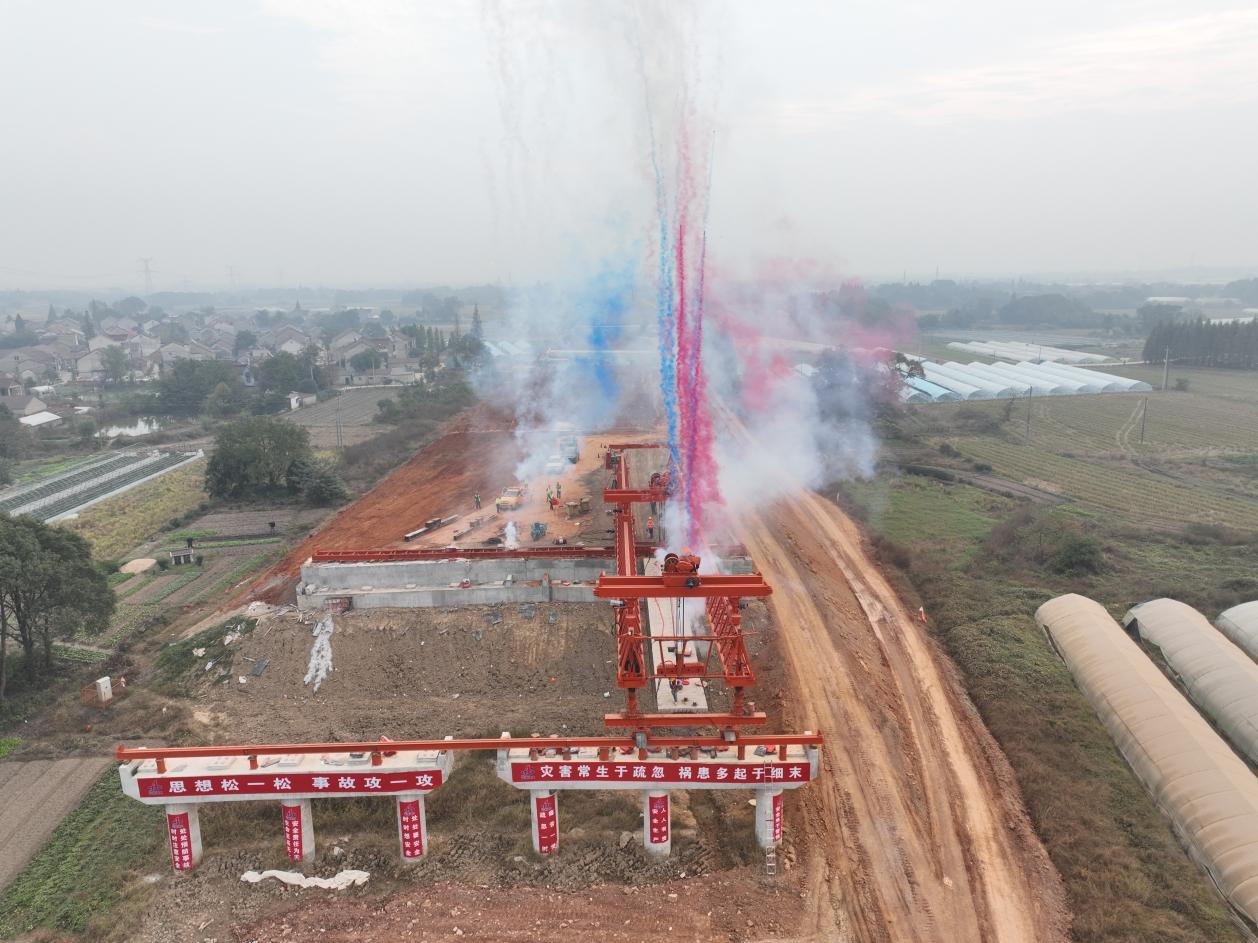 10月26日上午8點(diǎn)18分,滬渝高速廣宣改擴(kuò)建01標(biāo)無量溪大橋施工現(xiàn)場,一臺(tái)架橋機(jī)準(zhǔn)備就緒,起重小車吊起預(yù)制好的梁板后,經(jīng)空中軌道緩緩向前移動(dòng),現(xiàn)場施工人員穩(wěn)穩(wěn)地將一片長25m的預(yù)制箱梁架設(shè)在無量溪大橋的第1跨上,標(biāo)志著項(xiàng)目正式進(jìn)入橋梁上部結(jié)構(gòu)施工新階段。
