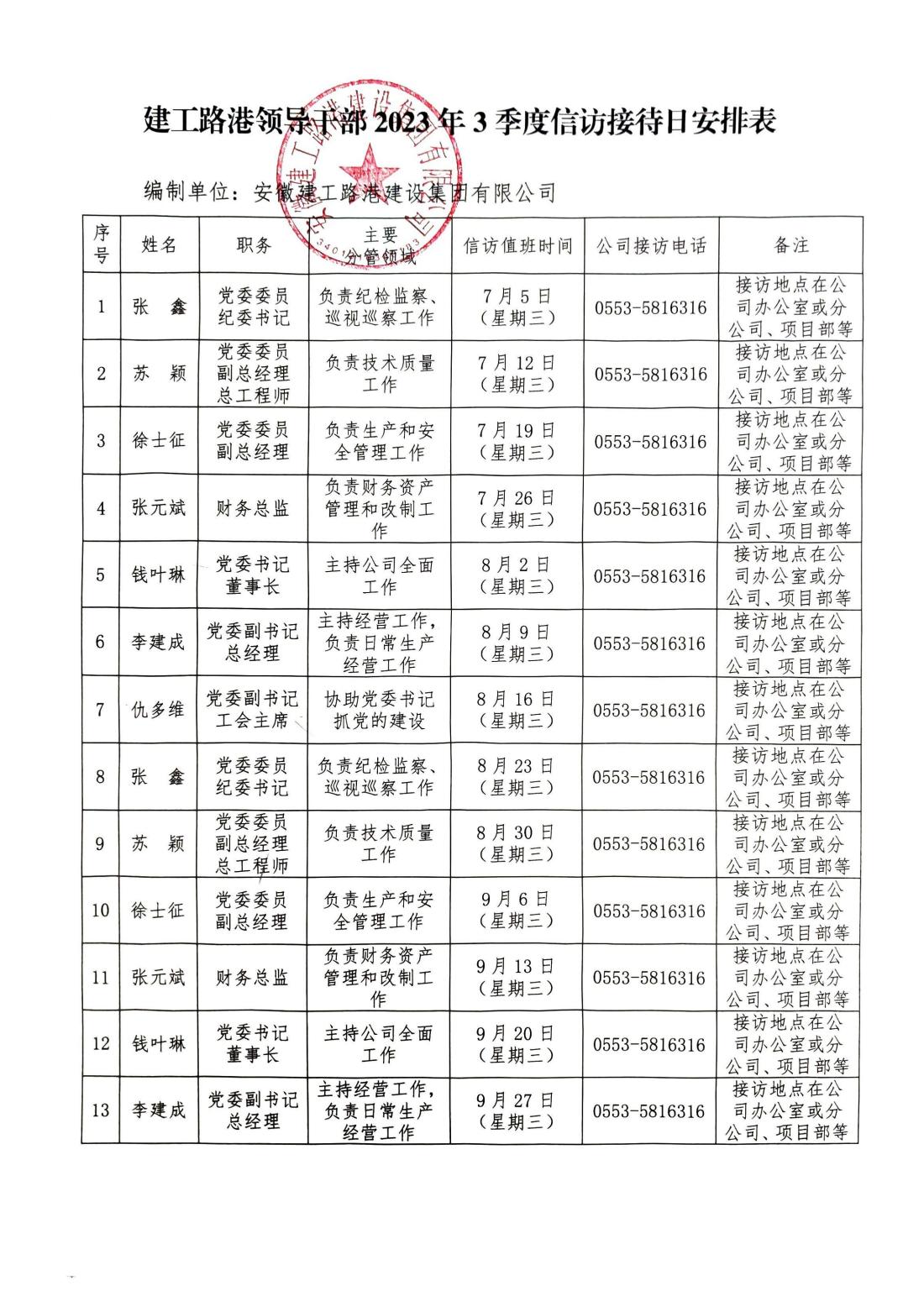 建工路港領(lǐng)導(dǎo)干部2023年3季度信訪接待日安排表
