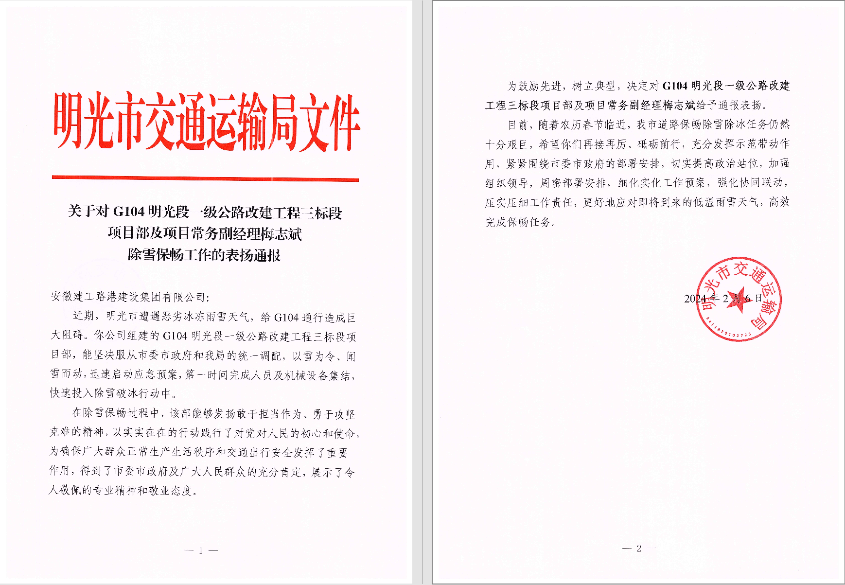 信中指出,連日的大雪天氣,G104三標(biāo)全體人員迎風(fēng)雪,戰(zhàn)嚴(yán)寒,積極投入到除雪保暢的行動(dòng)中,保障了長(zhǎng)三角春節(jié)返程 G104明光段公路的暢通無(wú)阻,得到了明光市委市政府及廣大人民群眾的充分肯定。
